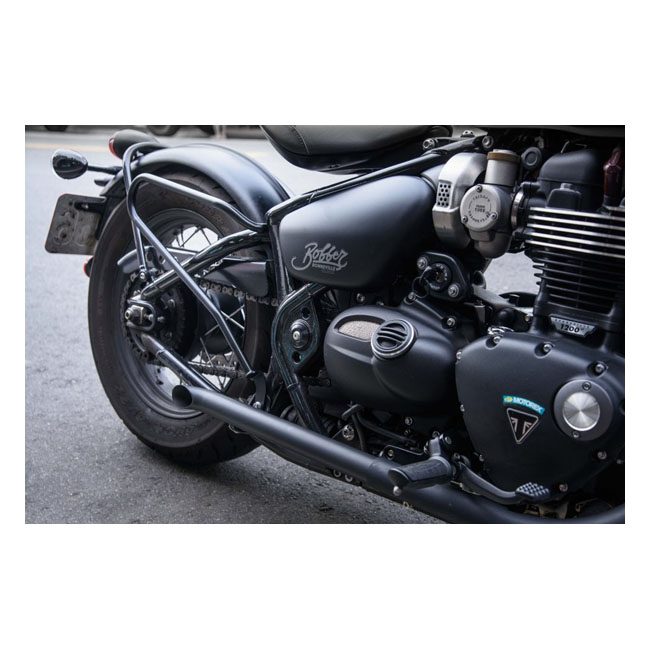 Black powder coated finish. These are called AC Pannier rails, luggage rails or saddlebag supports and used when installing saddlebags.