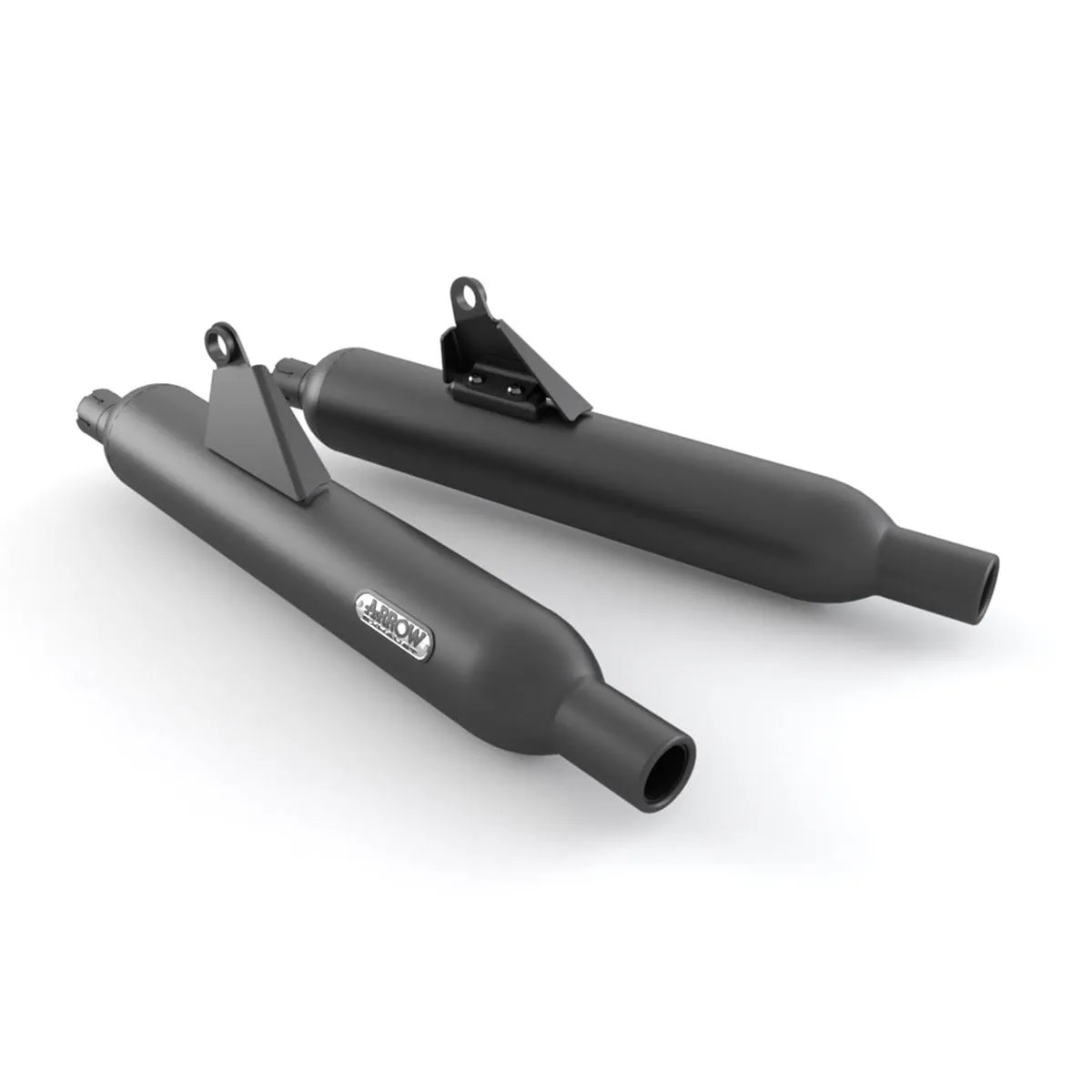 Een paar roestvaststalen geluiddempers in een zwarte, keramische coating geproduceerd door de uitlaatspecialisten Arrow.
