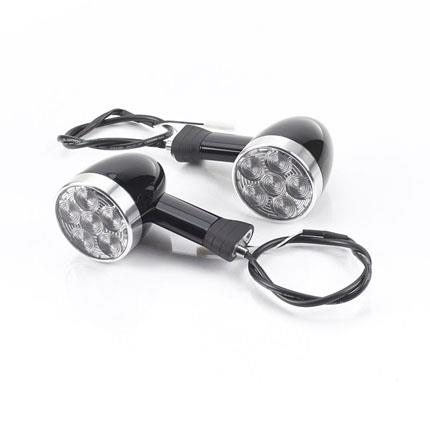 Een set van kogelvormige ledrichtingaanwijzers voorzien van een gedraaide aluminium sierring, hoogglanszwart huis en een heldere ledlens.