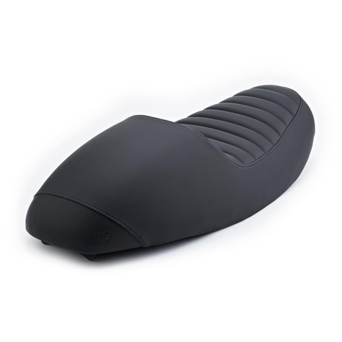 In the world of motorcycle customization, comfort traditionally takes a back seat to style. If you'll kindly pardon our pun, that changes now. The British Customs Cafe Racer Seat is sculpted to deliver a stunning visual transformation for your Modern Classic while delivering levels of comfort Gold Wing riders will envy. Retaining the original seat height, our Cafe Racer Seat is designed to enable a more natural riding position by evenly distributing your weight and adding some much appreciated lumbar support. Mounted as it should be, minus the stock rear fender, the BC Cafe Racer Seat instantly adds an aggressive stance in a single, beautiful bolt-on package - Its artfully trimmed sides expose just a hint of your bike's frame while the tuck-and-roll design of its cover combines with the classic cafe hump to epitomize the cafe racer look.