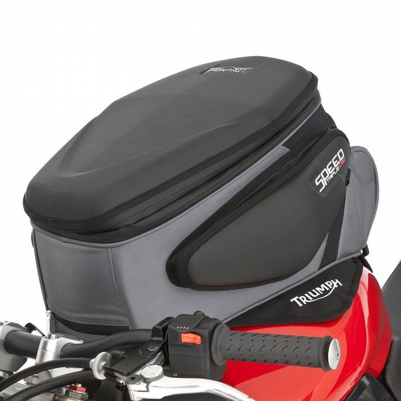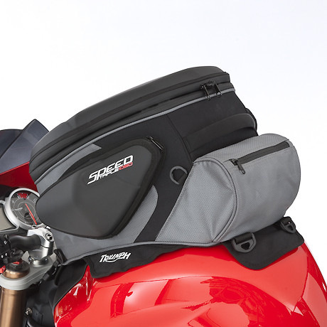 This compact tank bag features pre-formed construction with expandable capacity from 20 to 30 litres.