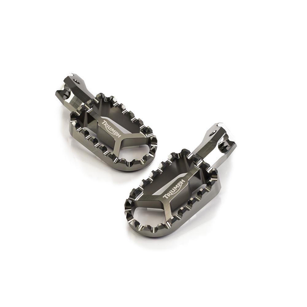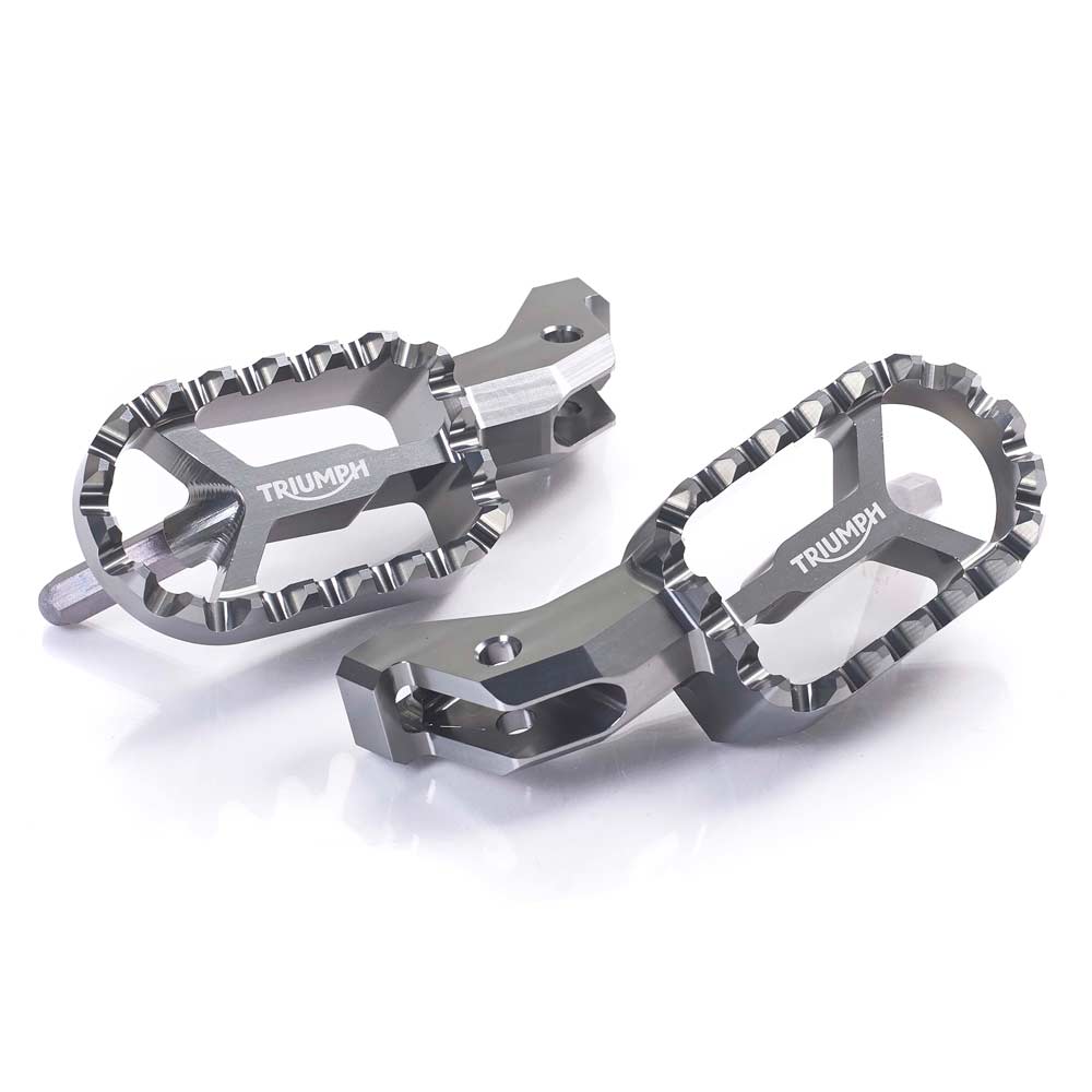These anodised footrests with Triumph branding feature a wider footprint for a more stable platform when riding on unforgiving terrain.