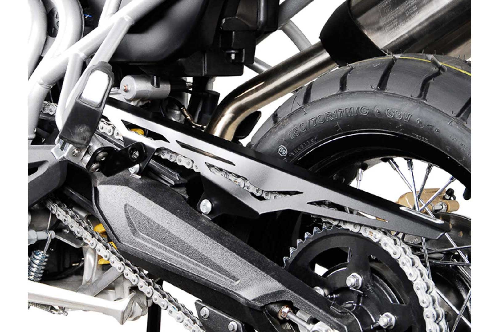 The SW-MOTECH chain guard is a high-quality alternative to the original plastic chain guard. The rubber-mounted attachment is easy to install.