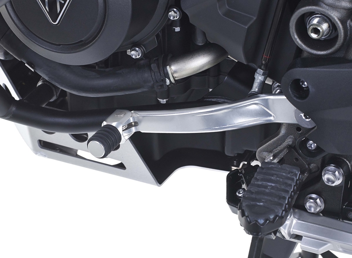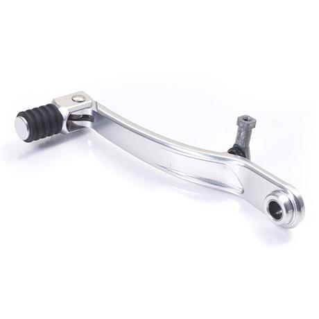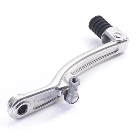The Triumph Folding Gear Pedal is CNC machined 6061-T6 aluminum. The rubber toe peg cover gives increased traction when riding on unforgiving terrain.